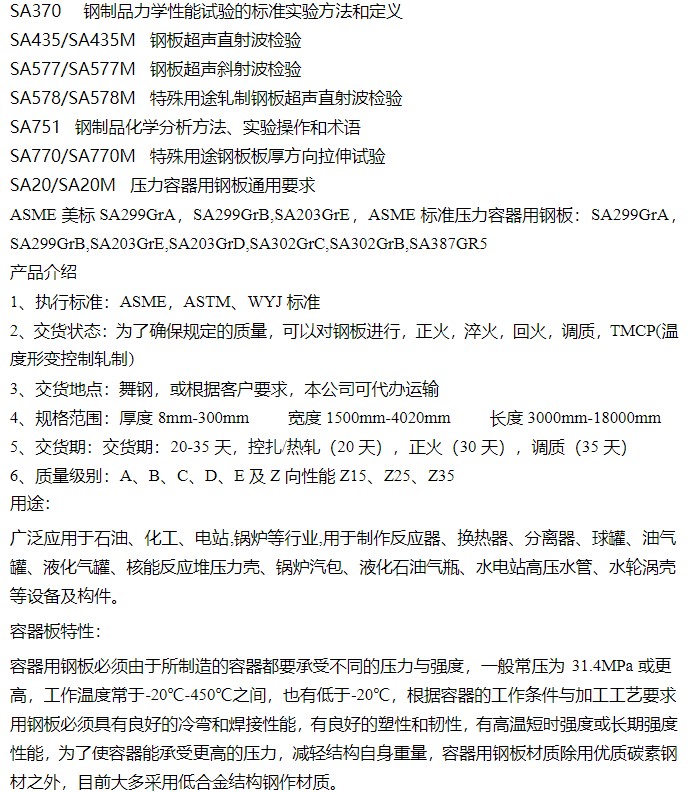 类别:容器板 13 牌号:SA 299 钢厂:宝钢、武钢、沙钢、舞钢、新余仓库:华虎库供应规格:薄板、中板、厚板、特厚板、及各种切割件