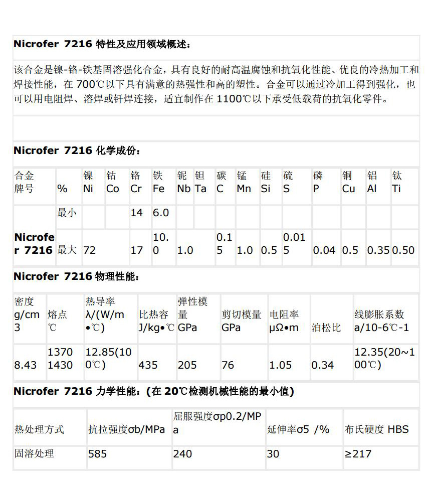 Nicrofer 7216 - 镍合金